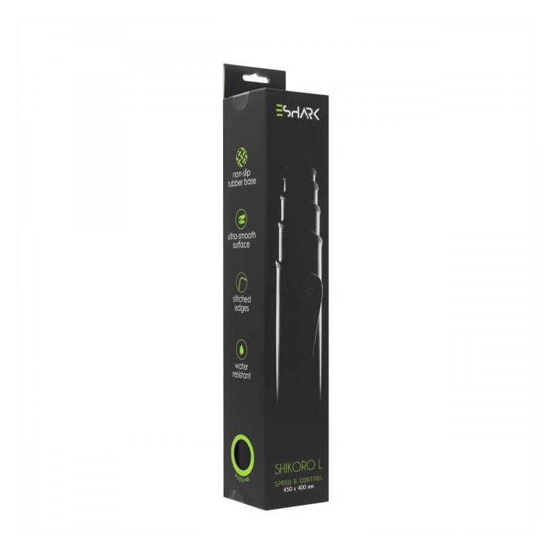 eShark SHIKORO L, ESL-MP5 gamer/esport egérpad, kimondottan az eSporthoz kifejlesztett egérpad. Vízlepargető, nagy sima felület, 45 x 40 cm optimalizálja a pontosságot. Cellurális 3 mm vastag gumitalp biztosítja, hogy játék közben az egéren kívül más ne mozduljon. Szegett szélei hosszú tartósságot biztosítanak.
