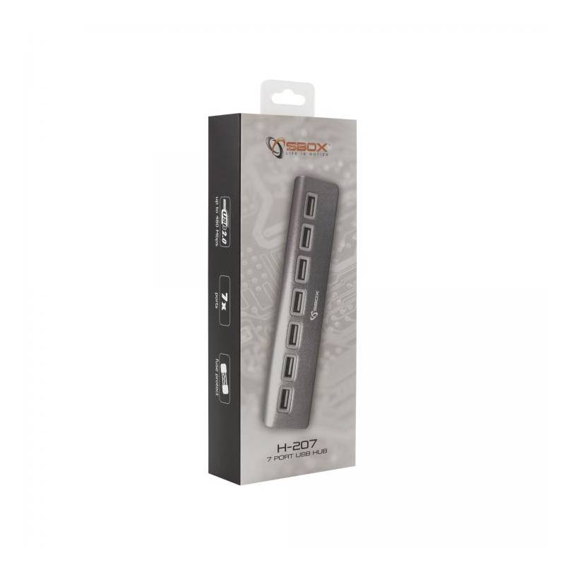 Sbox H-207 7 portos USB 2.0 HUB. Alumínium ház, kompakt hordozható 7 portos USB HUB 2.0 szabvány 480Mbps sebességig. Integrált feszültségszabályozó, áramvédelem. Nem szükséges telepíteni (Plug & Play).