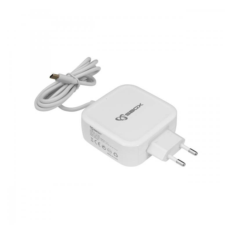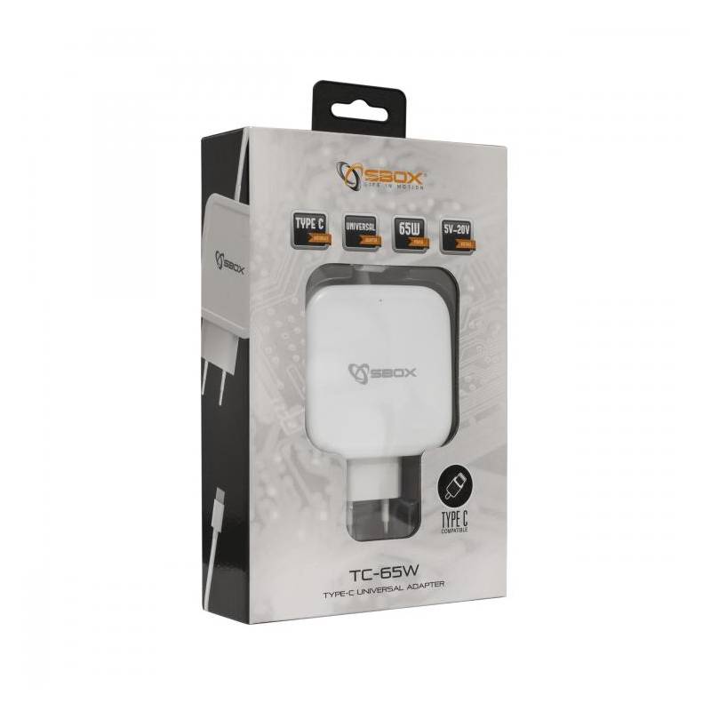Sbox TC-65 univerzáliszális Type-C hálózati töltő. 65W teljesítmény. bemenet: 100-240VAC, kimenetek 20VDC/3,25A; 15VDC/3A; 9VDC/3A; 5VDC/3A. Automatikus feszültség beállítás, övidzár elleni védelem. Alkalmas okostelefonok, tabletek és minden Type-C csatlakozón keresztül tölthető eszköz töltésére.
