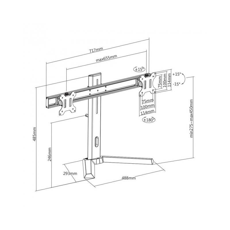 RHAMSES II GMS-3202, dual asztali monitortartó konzol 17″-27″ (43 – 69 cm) dönthető, forgatható. Asztali tartó talppal, VESA 75×75 és 100 x 100. Max. terhelhetőség: 7kg/monitor. Döntés:± 15 °. Forgatás: ±15 °, monitor forgatás: 360°